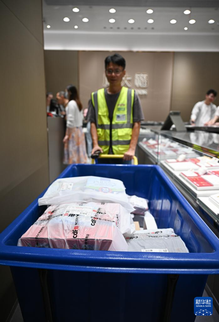 4月25日,工作人员在中免集团海口日月广场免税店转运顾客购买的离岛免税品。