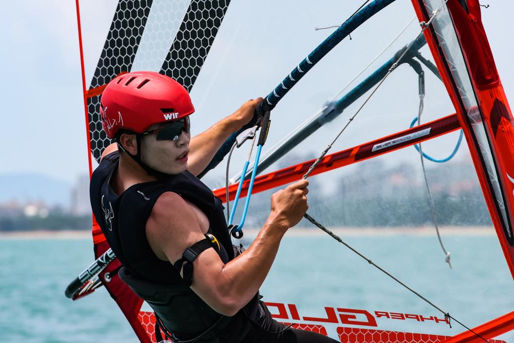 4月25日,中国选手王壹国在男子水翼帆板比赛中。新华社记者 张帆 摄