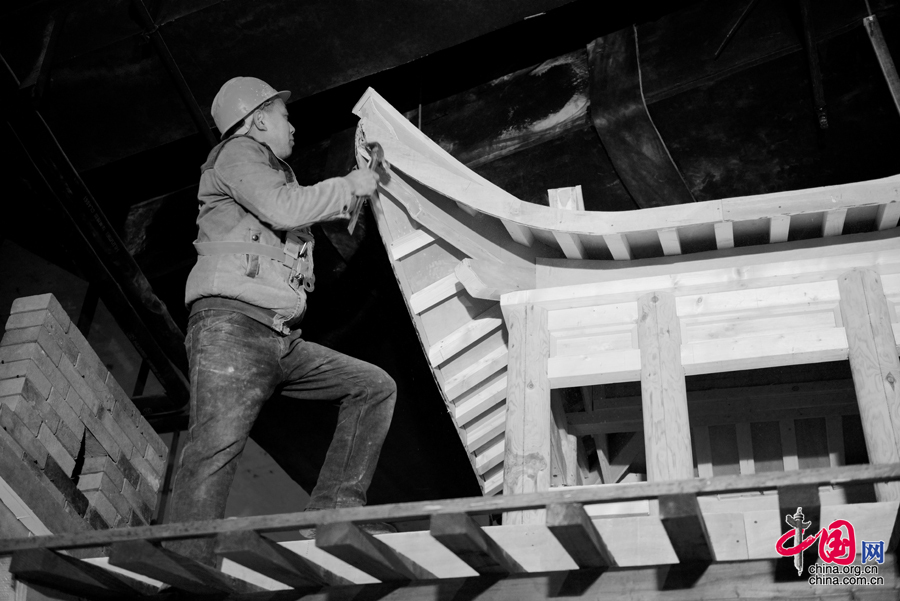 这是技艺高超额木工师傅在对古亭进行组装复原,工作严谨的他们力争将最好的亭楼展现在长春人民面前。 中国建筑第六工程局 于秉伟摄影