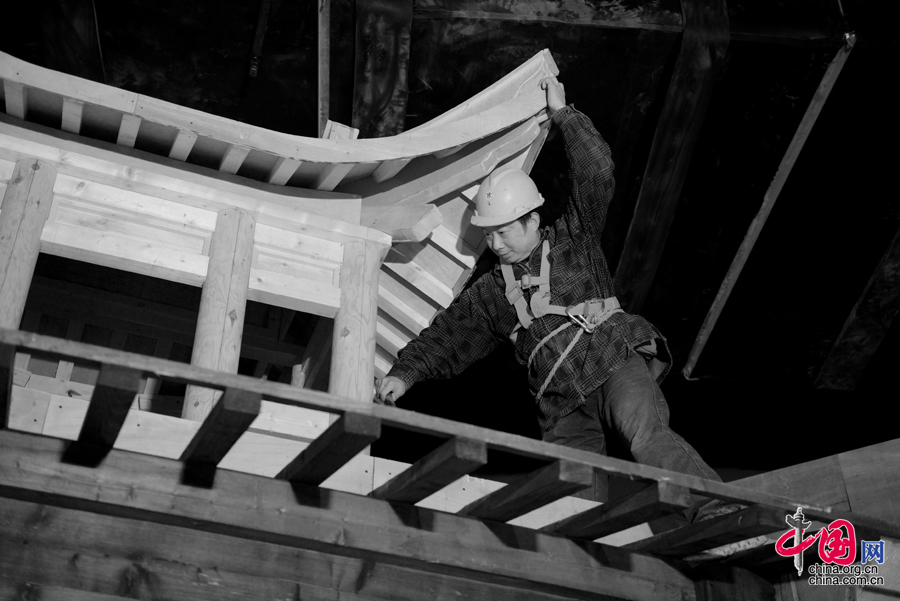 这是技艺高超额木工师傅在对古亭进行组装复原,工作严谨的他们力争将最好的亭楼展现在长春人民面前。中国建筑第六工程局 于秉伟摄影