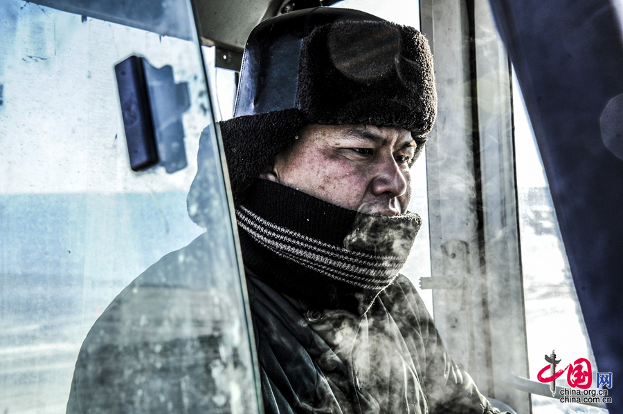 露天矿供电队动力班电工喜江操纵着电缆车,冒着刺骨的寒风进行室外收放电缆工作。 神华北电胜利能源有限公司 程晓雯摄影
