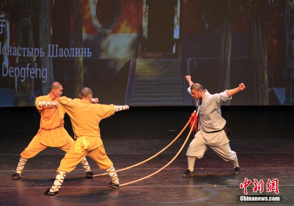 当地时间2月11日晚, 2016“文化中国·四海同春”纽约新春晚会在纽约市立大学Tribeca演艺中心精彩上演。容纳上千人的演出大厅座无虚席。图为嵩山少林寺武僧团表演武术象形拳、硬气功、禅功、十八般兵器,以真功夫赢得了观众热烈的掌声。中新社记者 阮煜琳 摄