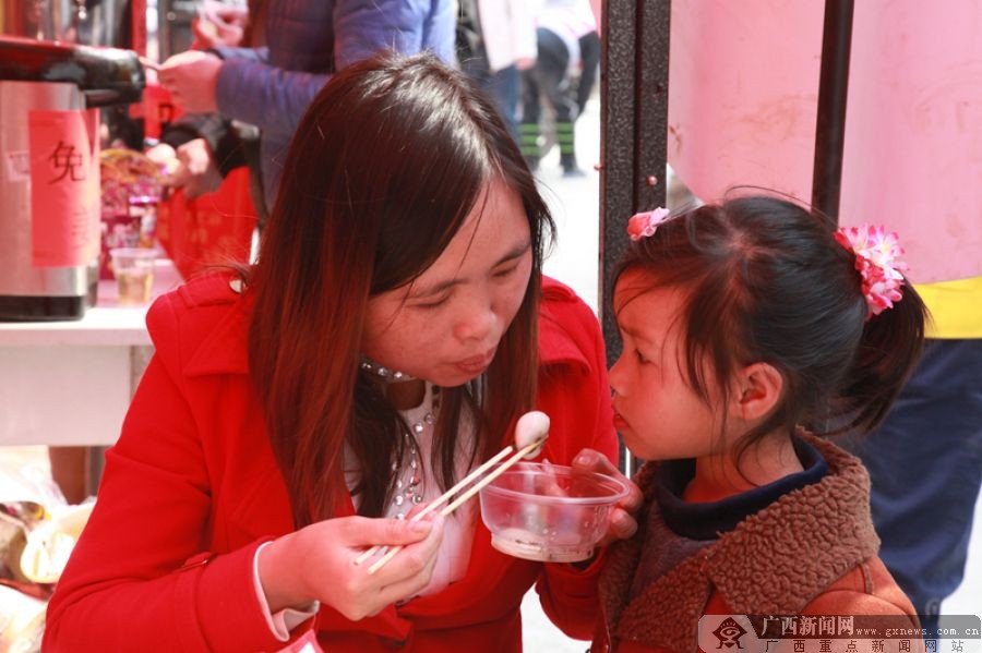 服务站内一位身穿红色衣服的母亲在给喂自己的孩子吃汤圆之前用力地吹,生怕汤圆太热烫着孩子。通讯员供图