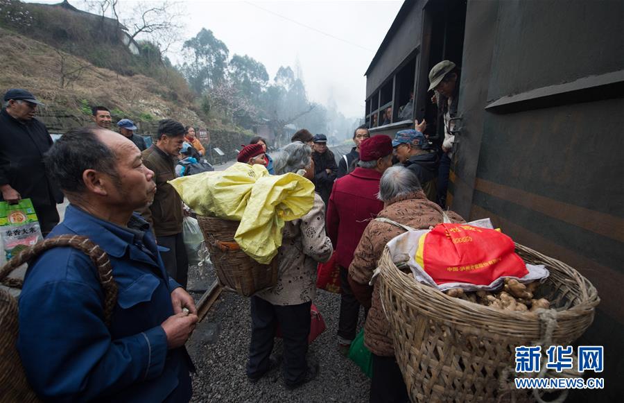 3月20日,山里山外的职工、家属及沿线村民乘坐嘉阳小火车出行。新华社记者 江宏景摄