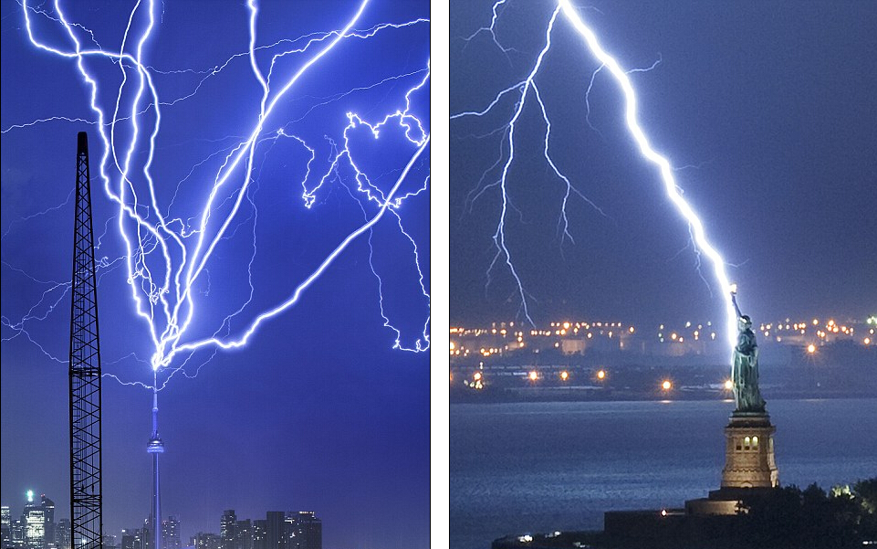 加拿大国家塔(CN Tower)和纽约自由女神像(Statue of Liberty)被闪电击中。(网页截图)