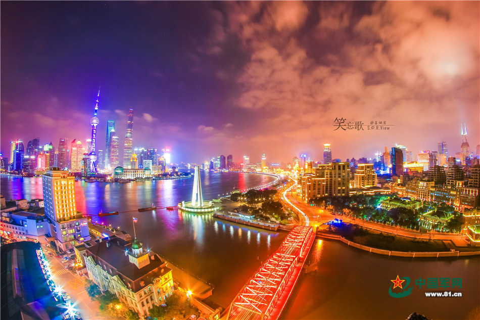鱼眼镜头将苏州河与黄浦江交汇处、浦江两岸的瑰丽夜景尽收眼底。吕炳宏摄影