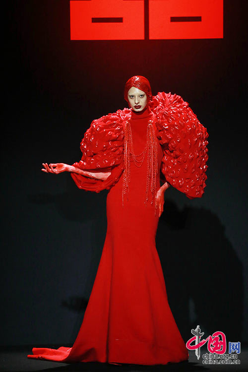 2016年3月31日,模特在梅赛德斯-奔驰中国国际时装周(2016/2017秋冬系列)上展示胡社光设计的时装作品。陈健男 摄