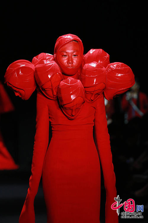 2016年3月31日,模特在梅赛德斯-奔驰中国国际时装周(2016/2017秋冬系列)上展示胡社光设计的时装作品。陈健男 摄