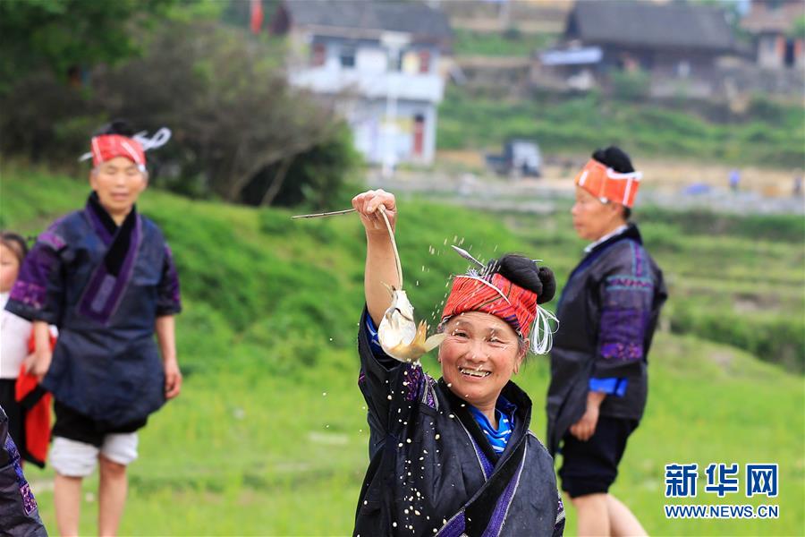 4月20日,在贵州省台江县老屯乡辣子村,当地的苗族男女在水田里参加“老庚捉鱼”活动。当日,贵州省台江苗族同胞喜迎苗族姊妹节。姊妹节是贵州黔东南州台江县苗族同胞的传统节日,2006年被列入第一批国家级非物质文化遗产名录。姊妹节期间,将举行“苗族盛装游演”“老庚下田捉鱼”等一系列苗族传统活动。新华社发(吴吉斌摄)