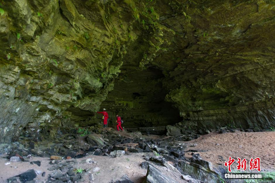 2016年中法联合洞穴科考队近日对外公布,贵州双河溶洞目前已探明长度为186.333公里,洞穴长度增加26公里多,居亚洲第二、中国第一,是世界最长的白云岩洞穴,也是世界面积最大的天青石沉积洞穴。法国洞穴联盟与贵州洞穴协会合作已有30年,合作勘探双河洞有近20年,双河洞从1987年开始勘探,长度从最初的25公里“长长”到如今的186.333公里。图为探险队员在溶洞洞口进行探险。中新社记者贺俊怡 摄