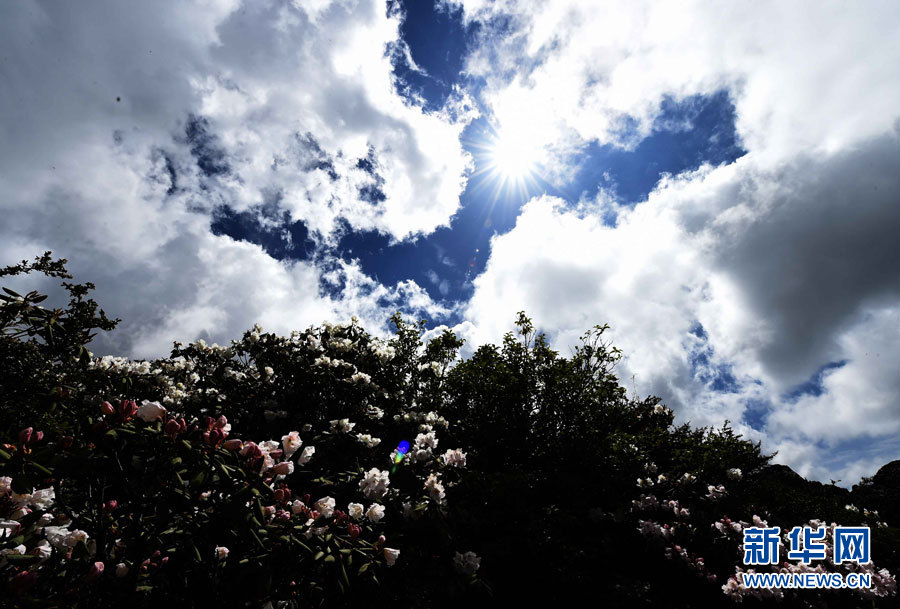昭通市昭阳区大坪子山峰光影下的杜鹃花(6月3日摄)。初夏时节,在地处乌蒙山深处的云南省昭通市昭阳区靖安镇海拔近3000米的大坪子村,上万亩高山杜鹃花竞相绽放,美景如画。新华社记者杨宗友 摄