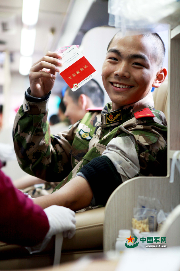 放假休息时,有的战士会去献血,这是武警战士张宇飞在献血的同时,骄傲地展示自己的献血证。陈勇松摄影