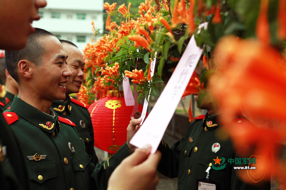 遇到传统节日,战士们的活动也多姿多彩。这是武警战士在进行猜灯迷活动。廖键摄影