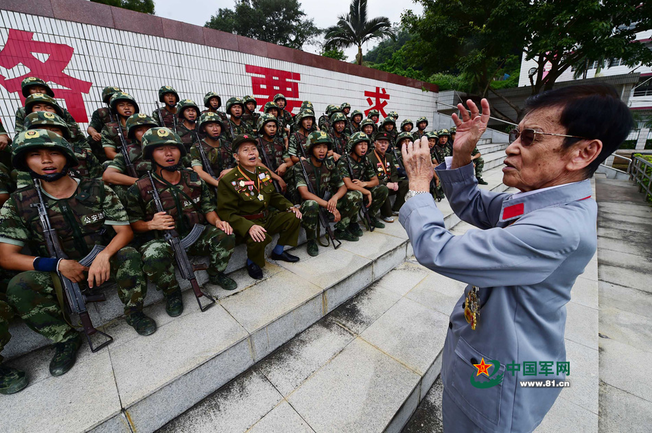 有一种休息是听抗战老兵讲述过去的故事:抗战老兵进军营为官兵讲述抗战事迹,这是抗战老兵陈敏学指挥武警广东边防总队机动支队官兵一起高唱抗战歌曲。廖健摄影