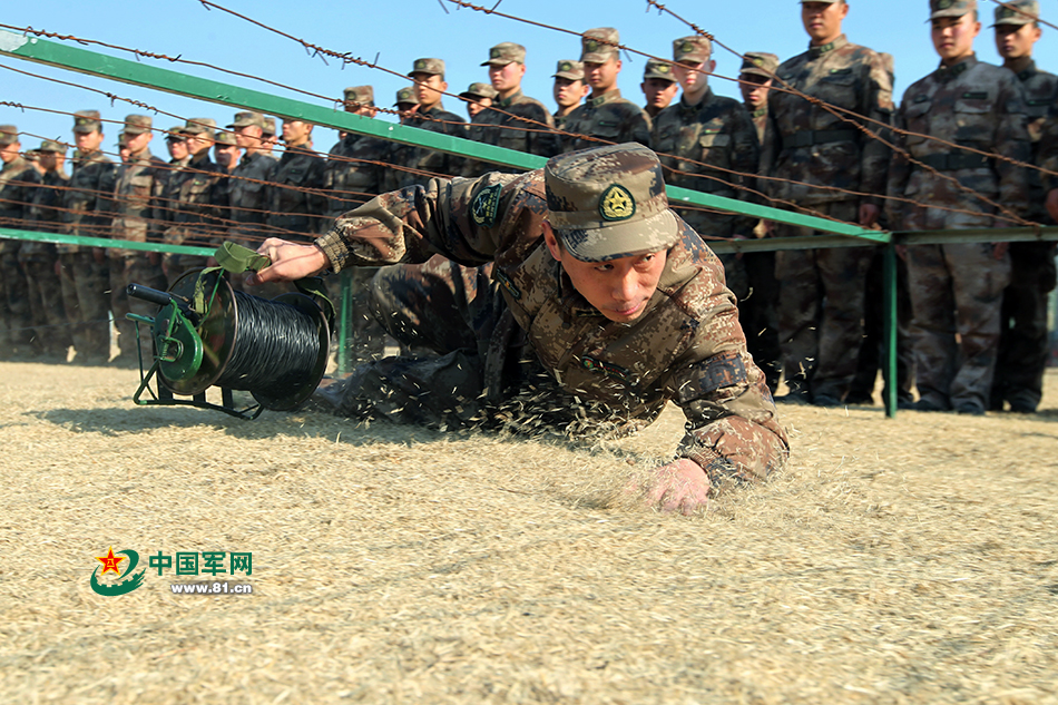 2014年1月4日,共产党员、陆军第26集团军通信团团长胡建家在训练场上为战士做示范,当天是该团开训的第一天。