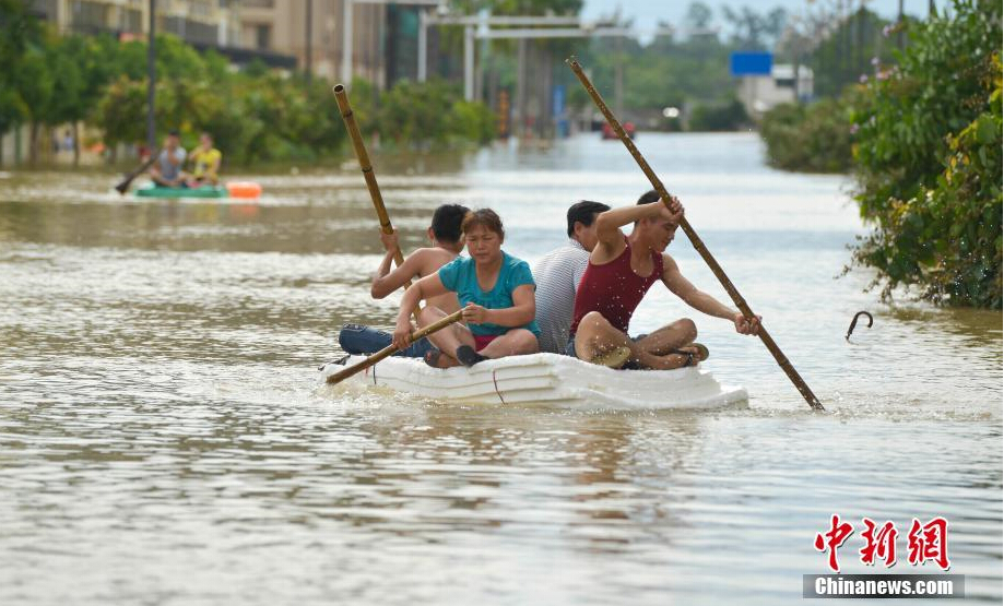 8月19日,台风“电母”致海南西部多市县连续出现大到暴雨天气。海南省临高县人民医院附近区域被一米余深的洪水围困,周边民众自制简易泡沫小船勉强进出。 中新社记者 骆云飞 摄