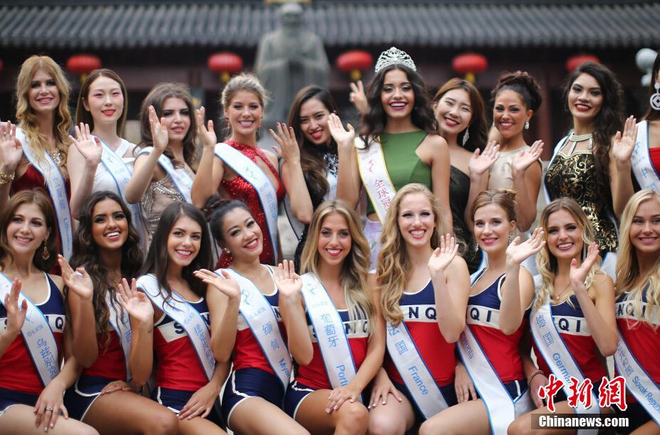 9月11日,来自50个国家和地区、参加2016年第51届全球生态旅游大使世界总决赛的选手们亮相南京夫子庙广场,用一场动感的快闪开启她们的“美丽中国行”。中新社记者 泱波 摄