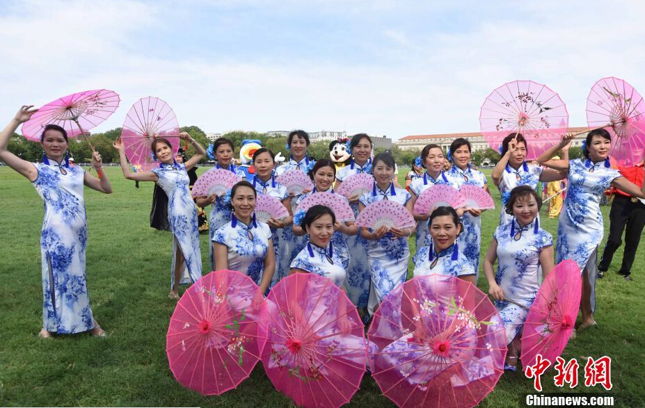当地时间9月5日,2016中美旅游年大型“快闪”活动在美国首都华盛顿白宫南侧的大草坪举行,旨在推广中国旅游形象,促进两国民间友好。图为现场民众表演伞舞和扇子舞。 中新社记者 张蔚然 摄