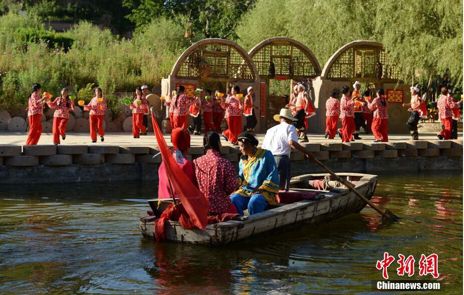著名歌曲《东方红》诞生自陕西省佳县,当地的赤牛坬村也是陕北民歌的故乡。近日,由当地农民组成的艺术团自编自演黄土高原乡村原生态大型实景演出《高高山上一头牛》,受到观看者的好评。整场演出以陕北农耕文化为主题,以半山半水为舞台,参与演出的演员近百人全部为本村村民。 中新社记者 毛建军 摄