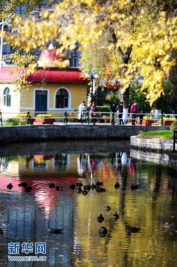 10月18日在哈尔滨兆麟公园拍摄的鸳鸯。每年10月末是鸳鸯南飞的日子,在黑龙江哈尔滨兆麟公园,近百只鸳鸯在公园内的鸳鸯湖等待南飞。新华社记者 王凯 摄
