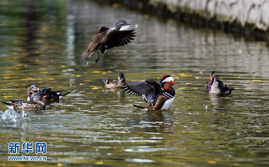 在哈尔滨兆麟公园拍摄的鸳鸯(10月18日摄)。每年10月末是鸳鸯南飞的日子,在黑龙江哈尔滨兆麟公园,近百只鸳鸯在公园内的鸳鸯湖等待南飞。新华社记者 王凯 摄