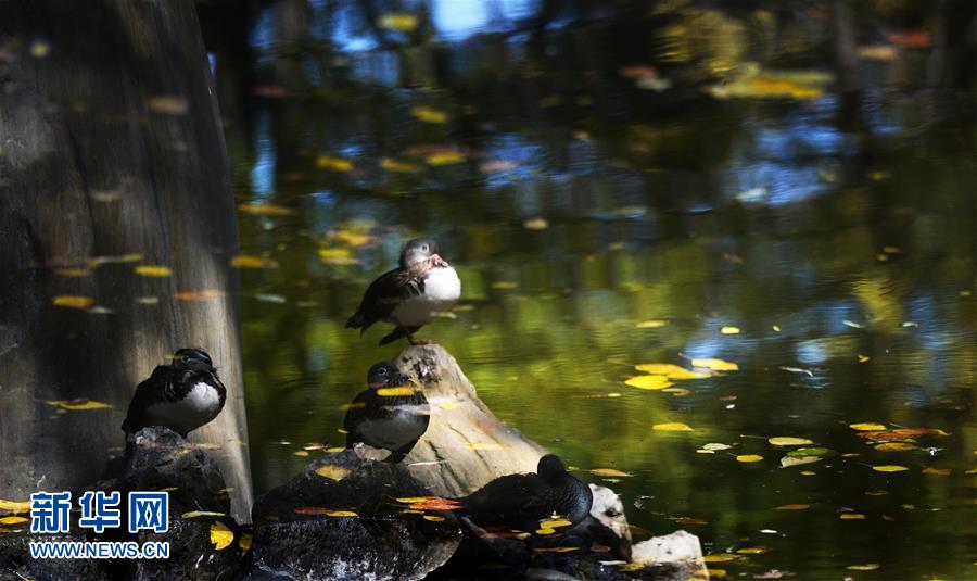 鸳鸯在哈尔滨兆麟公园鸳鸯湖内休憩(10月18日摄,照片上下翻转)。每年10月末是鸳鸯南飞的日子,在黑龙江哈尔滨兆麟公园,近百只鸳鸯在公园内的鸳鸯湖等待南飞。新华社记者 王凯 摄