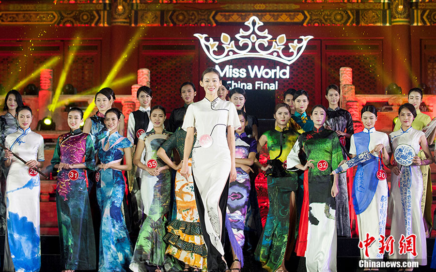 10月20日,第66届世界小姐中国区总决赛暨颁奖盛典在北京太庙正殿举行。比赛当晚,一场秋雨使得现场温度骤降,身着礼服的佳丽们在低温下坚持完成了比赛。最终,孔敬夺得桂冠,成为新一届“中国小姐”。图为佳丽们冒雨进行比赛。 中新网记者 李卿 摄