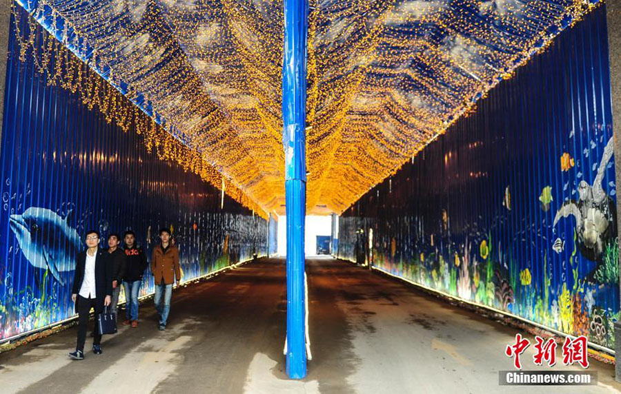 10月25日,济南一条用钢板搭建的临时通道变身“海底世界”,数百米围挡上画满海洋动物图案,路人行走之中如同穿越“海底隧道”。中新社记者 张勇 摄
