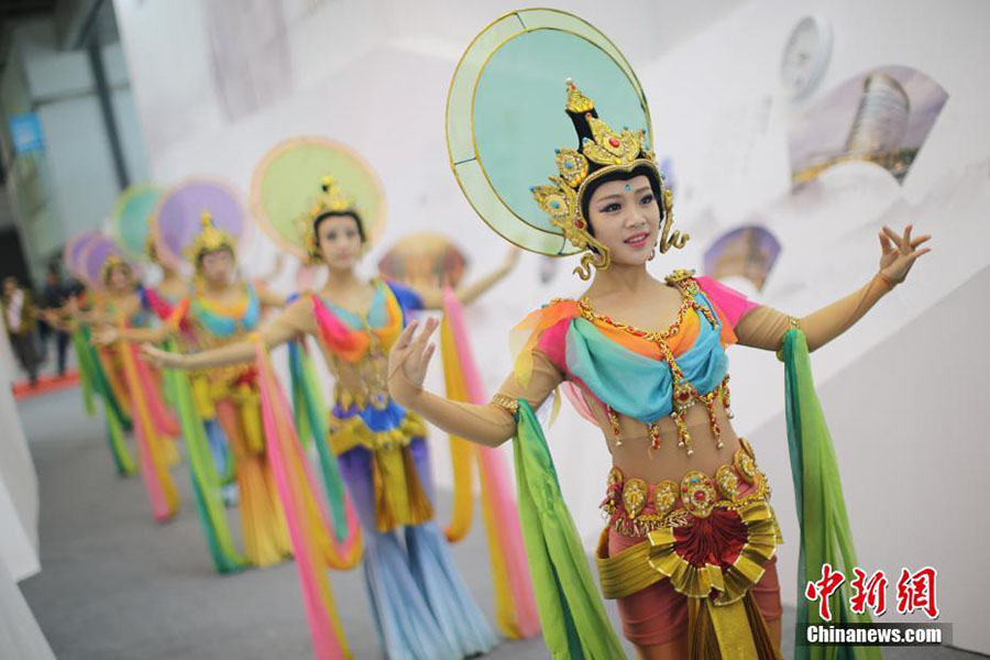 10月28日,一群参加《报恩盛典》南京大报恩寺遗址公园大型实景演出的演员们身着剧中盛装,亮相中国南京文化创意产业交易会,伴着音乐跳舞玩快闪。中新社记者 泱波 摄