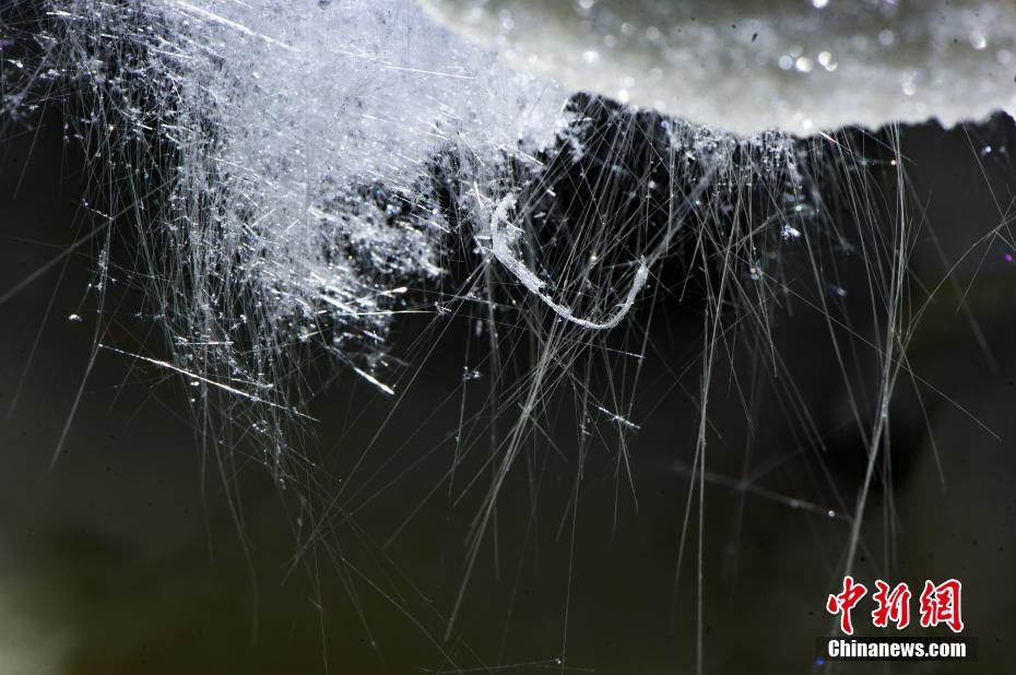 10月31日,微距镜头下的丝状石膏晶体,细如发丝。双河洞国家地质公园,位于贵州省遵义市绥阳县温泉镇,是中国最大的溶洞群。2016年4月中法联合洞穴科考队对外公布,贵州双河溶洞目前已探明长度为186.333公里,洞穴长度增加26公里多,居亚洲第二、中国第一,是世界最长的白云岩洞穴,也是世界面积最大的天青石沉积洞穴。中新社记者贺俊怡 摄