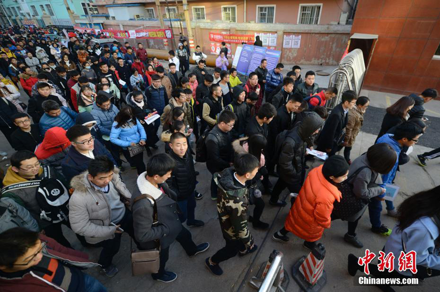 11月27日,山西太原,参加2017年中国国家公务员考试的考生们陆续进入考场。据官方数据显示,中国国家公务员考试报名已经连续9年在百万人以上,其中2014年度国考报名人数达152万人的峰值,2015年和2016年国考的报名人数分别下降至140.9万和139.46万。中新社记者 韦亮 摄