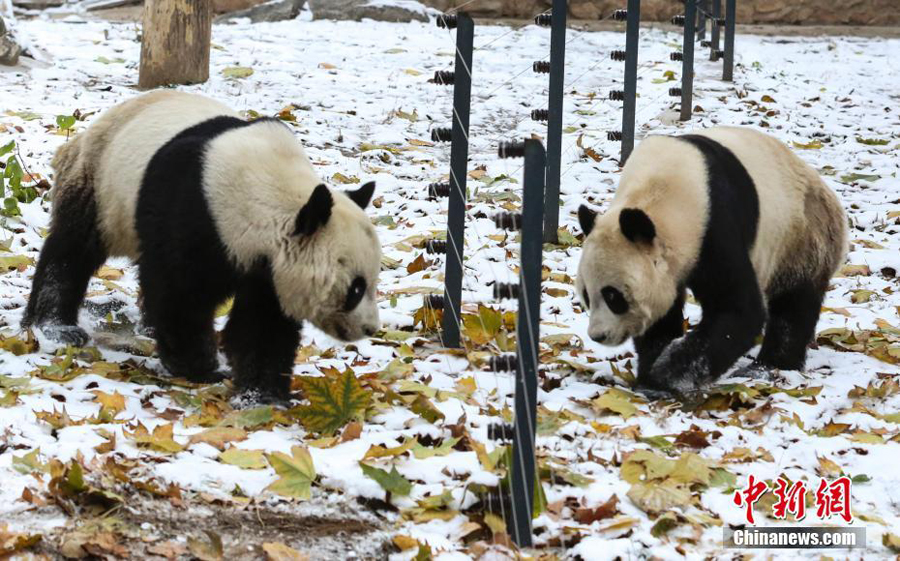 11月22日,济南降下入冬后第一场雪,给连日雾霾笼罩的城市带来些许清新,济南动物园的大熊猫雪中漫步,别有一番情趣。 中新社记者 张勇 摄