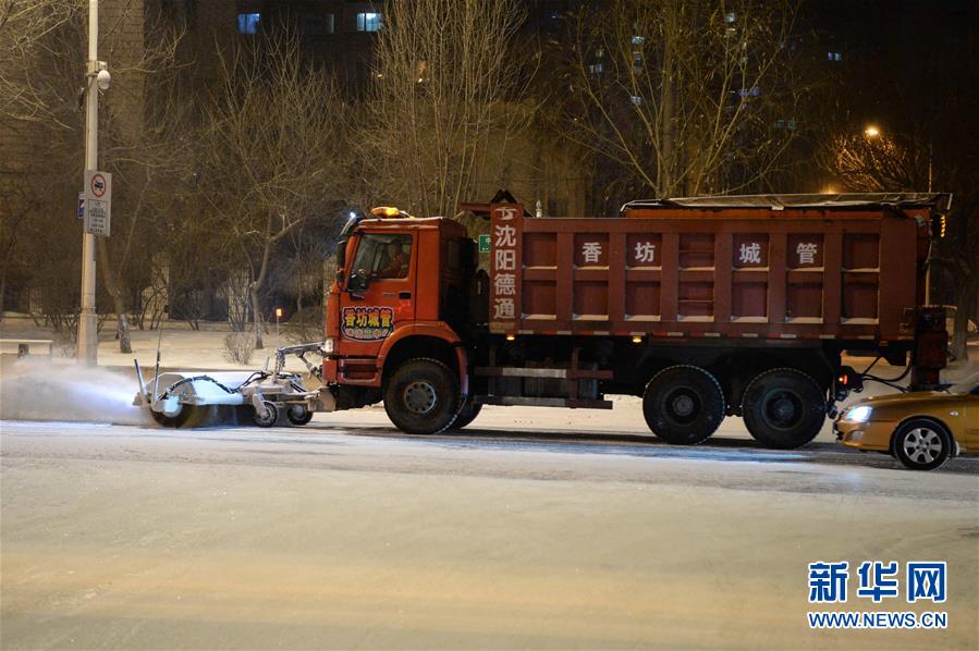2月19日夜,清雪车在哈尔滨市区一条主干道上进行清雪作业。