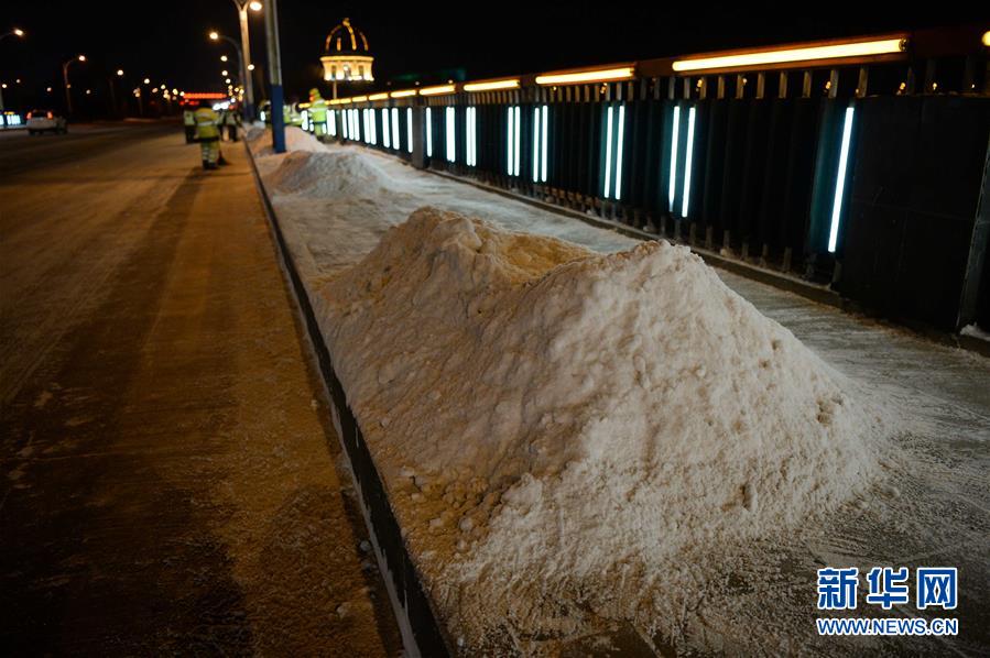 2月19日夜,哈尔滨松花江公路大桥上的积雪被环卫工人清理好,准备装车运走。