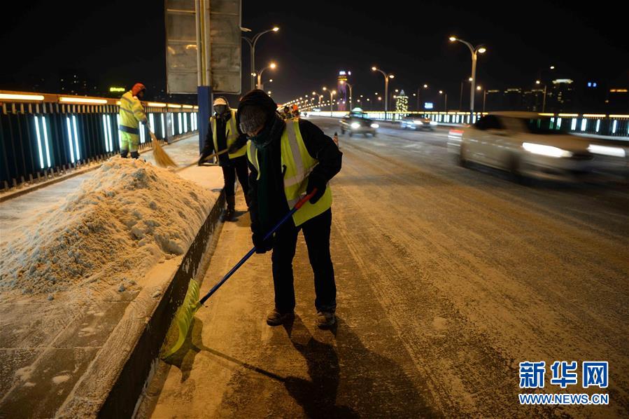 2月19日夜,环卫工人在哈尔滨松花江公路大桥上进行清雪作业。