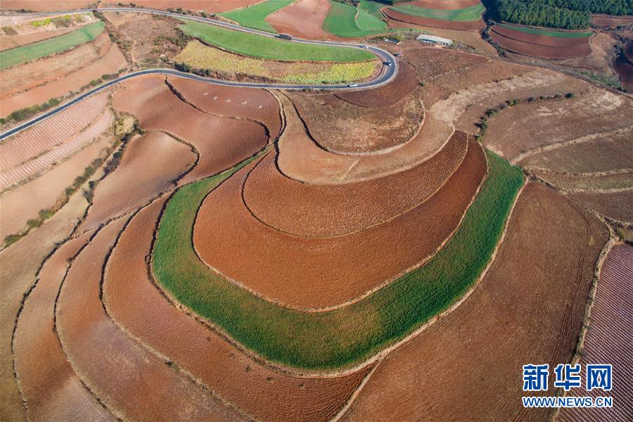 这是云南东川红土地一景(2月18日摄)。东川红土地位于云南省昆明市东川区西南40多公里的红土地镇,主要景点在海拔1800米至2600米之间,因独特的地貌和气候发育而成的红色土壤而闻名。据了解,当地的土壤含铁、铝成分较多,有机质少,酸性强,土质黏重。这片气势磅礴、色彩斑斓的红土地,在蓝天、白云和变幻莫测的光线下,形成了神奇壮美的景色。新华社记者胡超 摄