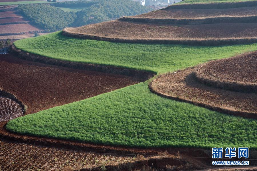 这是云南东川红土地一景(2月18日摄)。东川红土地位于云南省昆明市东川区西南40多公里的红土地镇,主要景点在海拔1800米至2600米之间,因独特的地貌和气候发育而成的红色土壤而闻名。据了解,当地的土壤含铁、铝成分较多,有机质少,酸性强,土质黏重。这片气势磅礴、色彩斑斓的红土地,在蓝天、白云和变幻莫测的光线下,形成了神奇壮美的景色。新华社记者胡超 摄