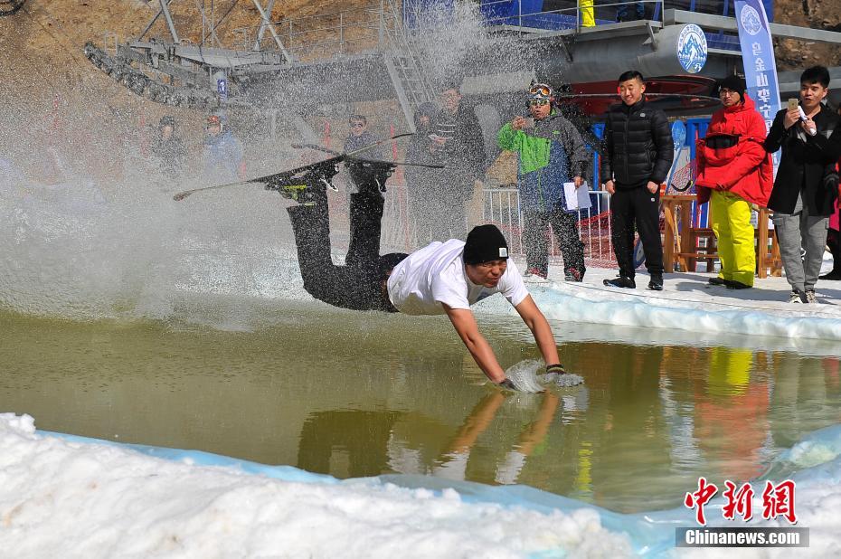 2月26日,山西晋中乌金山,滑雪选手着短袖从高山雪道下滑,在穿越终点水池时不慎落水。当日,一场“光猪”滑雪过水比赛在当地举行,吸引众多年轻滑雪爱好者参与。中新社记者韦亮 摄