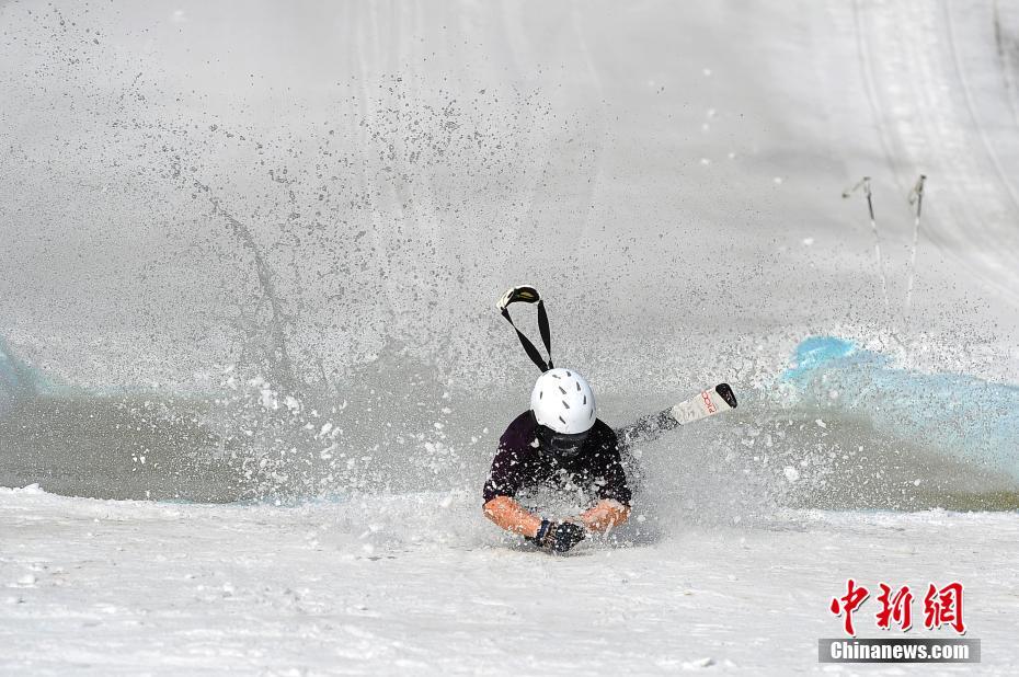 2月26日,山西晋中乌金山,滑雪选手从高山雪道下滑,在穿越终点水池时不慎摔倒。当日,一场“光猪”滑雪过水比赛在当地举行,吸引众多年轻滑雪爱好者参与。中新社记者韦亮 摄