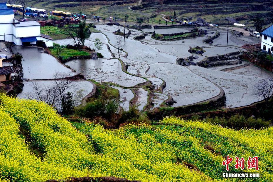 3月18日,江西省横峰县举办首届梯田油菜花旅游节,金黄色油菜花在层层叠叠的梯田间绽放,与农舍白墙黛瓦、远山云雾构成了一幅绚丽的乡村画卷。数千名游客冒着绵绵细雨,手撑雨伞,漫步在田间阡陌赏花。艾世民摄