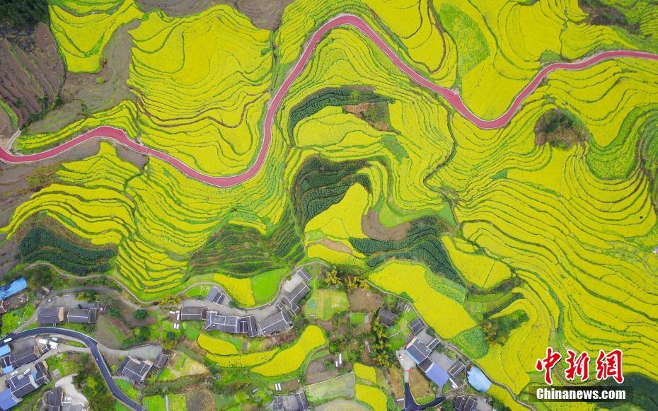 3月19日,航拍余庆县红渡村外梯田盛开的油菜花。近日,贵州省余庆县红渡村万亩梯田种植的油菜花竞相开放,一条红色路面的旅游公路贯穿其中,如同为花田系上红色发带。中新社记者 贺俊怡 摄