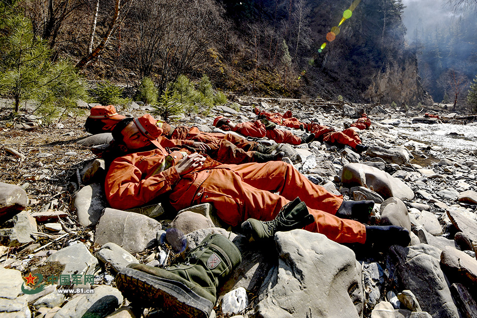 2016年3月6日,武警兰州森林大队官兵在扑灭达拉火场第九段处的火灾后,战士们躺在河滩上睡着了。