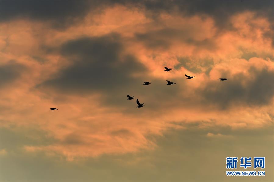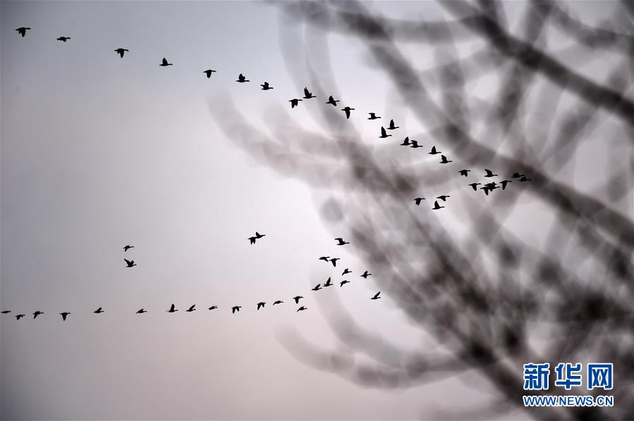 新华社照片,密山(黑龙江),2017年3月28日 晓看林间羽 候鸟穿云归候鸟在兴凯湖国家级自然保护区上空飞翔(3月27日摄)。时下正值候鸟北归期,黑龙江省密山市兴凯湖国家级自然保护区迎来大批北归的候鸟。新华社记者 王建威摄