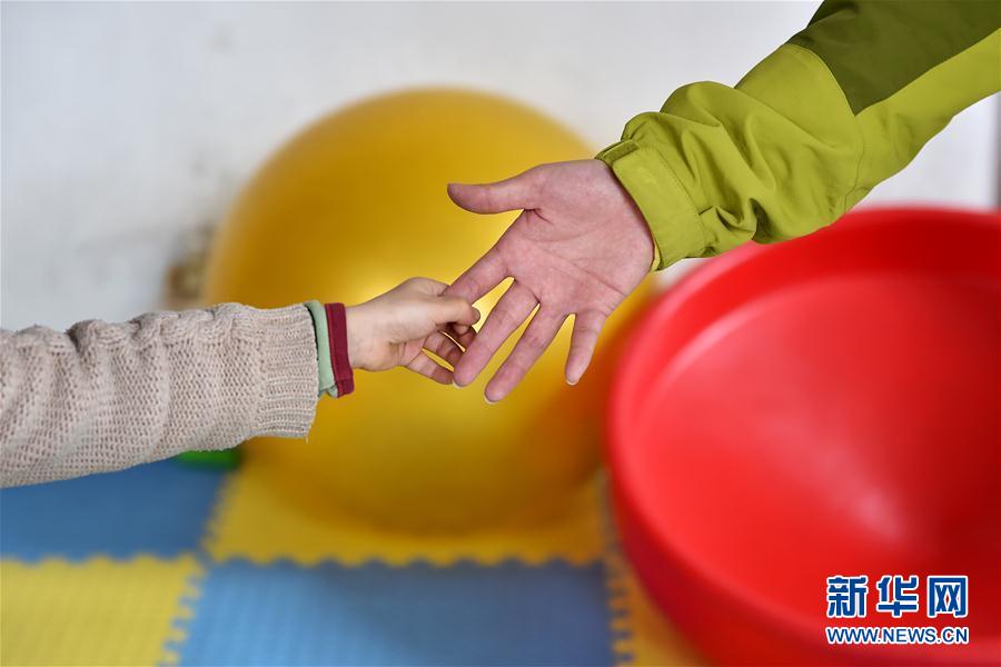 3月28日,在太原灵星社区服务中心,一名小朋友在一对一课程上拉着老师的手。 新华社记者詹彦 摄