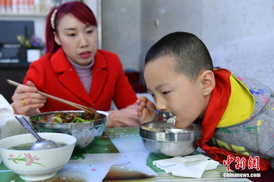 3月28日,正在吃饭的小天健。中新社记者 刘忠俊 摄