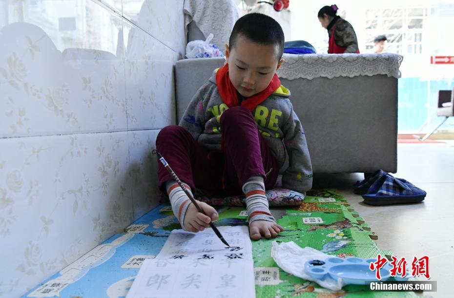 3月28日,小天健练习写毛笔字。中新社记者 刘忠俊 摄