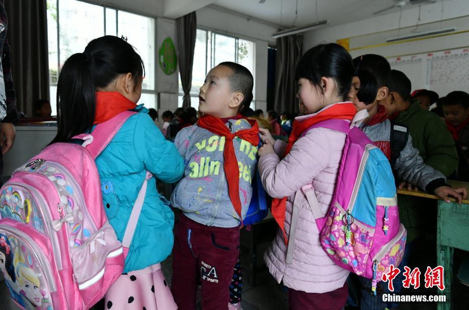 3月28日,放学了,同学们帮助天健把背书包背上。刘忠俊摄