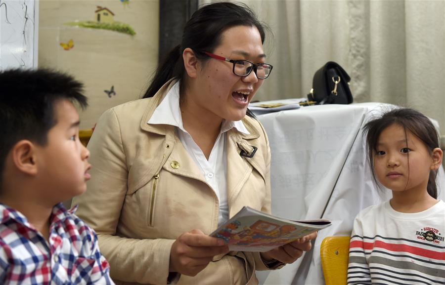 5月3日,在“四点半课堂”英语课上,志愿者陈仪娴(中)正在带领孩子们朗读英语小故事。安徽省合肥市蜀山区文博苑社区常年为社区孩子们开展“四点半课堂”活动,其中不少“90后”的志愿者老师们长期义务为这些孩子开展英语等课程教学,丰富孩子们课余生活。新华社记者郭晨 摄