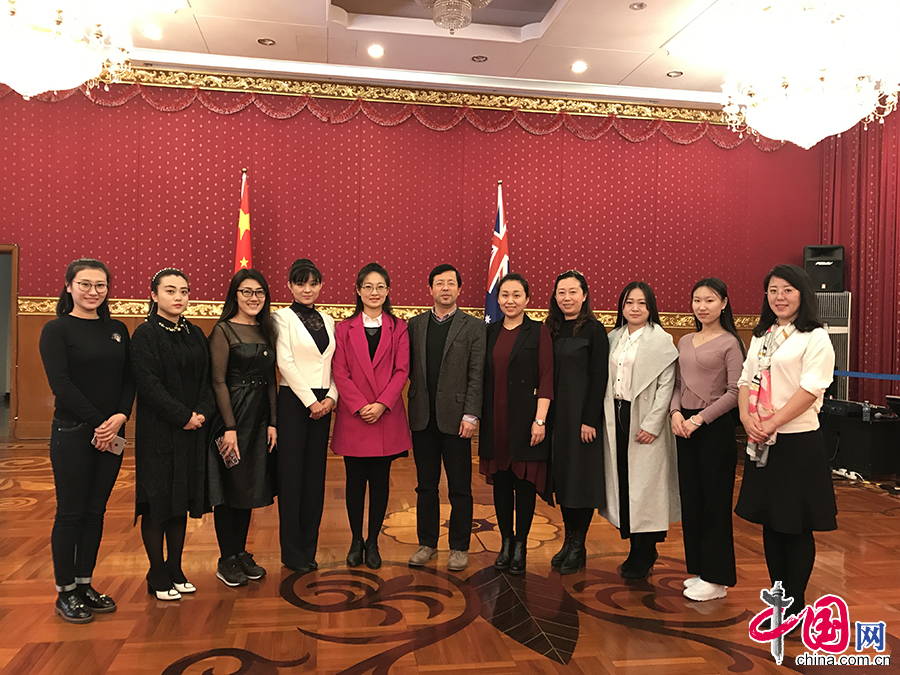 中国驻澳大利亚大使馆公使衔参赞杨治与中国东方乐团成员在使馆合影留念。