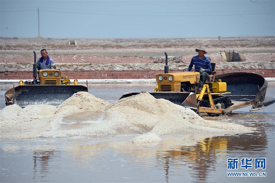 5月20日,无棣县鲁北盐场工人在机械化收盐。
